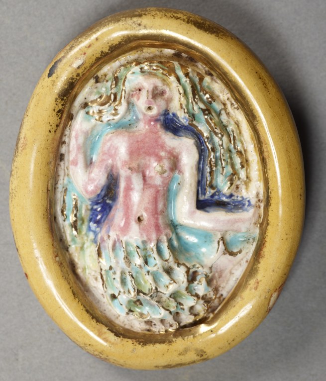Broche La Sirène, terre cuite émaillée, or et fer. Musée Robert Tatin