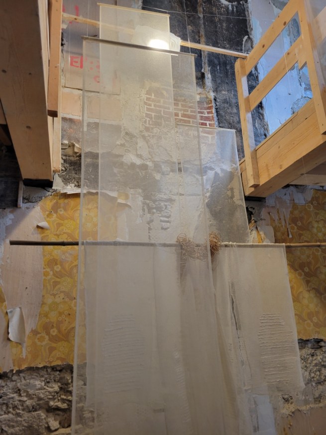 Les sens s’éveillent par la richesse de ces tableaux ou sculptures dans les sites, qui sont d’une richesse patrimoniale très importante, et dans un intérieur parfois presque en chantier où l’on retrouve encore des traces de papier peint, de moulures. Entre la richesse de l’extérieur et la matière brute des murs, on y découvre les œuvres. La douceur des créations, même si elles représentent la tristesse ou la douleur, avec les matériaux qui contrastent avec la beauté de l’extérieur , apportent une dimension particulière.